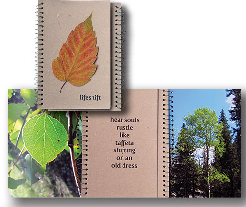 The third in the Death Books series, lifeshift pays homage to artist Linda Cunningham’s late husband, told in photographs of Banff National Park in Alberta, Canada. Mounted on a covered base, the double-bound (copper-wire spiral) book walks through the mixed spruce and aspen forest towards ultimate destruction. Enclosed in a protective slipcover, the book consists of six photographs, original inkjet-printed text, and a unique fall leaf. lifeshift is 6.5” x 5.25” x 1”. Edition of 3, $400.