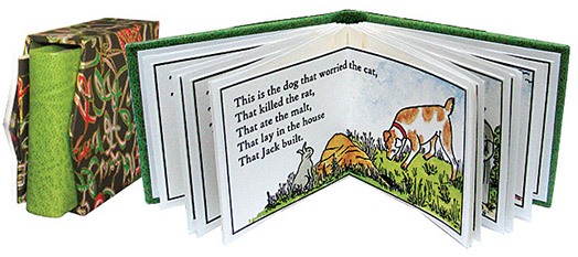 Inspired by the dozens of “Jacks” in the Toronto Public Library, this version of The House that Jack Built is bound in carousel or star form, giving an extra dimension to the twelve double-page spreads of hand-colored scenes. Letterpress printed from polymer plates, on Magnani mouldmade paper, hand bound in green goatskin leather with gold blocked title and contained in a house-shaped slipcase, a separate booklet of notes on the origins of the rhyme accompanies the book. Distinguished Book Award (Miniature Book Society 2005). Judge Magda Saina’s comment: “Great illustration appropriate to the subject and origin of story.” Size 2.75” x 2.125”, Edition of 40 (signed), CAD $475.