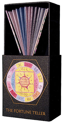 Thirty-second sound bites, fleeting images glimpsed from a car window, or snatches of music spark unlikely offspring, such as The Fortune Teller. Inspired by a brief BBC Antiques Roadshow segment, this unique fan-shaped binding mimics the fortune-telling skirt of an antique doll, recreating a traditional entertainment in book form. Book size 2.75” x 1.75” x 2.5”. Includes decorated box. Edition of 49, CA$ 215.00.