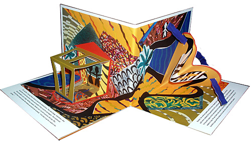 Too Much Order is a fable about fear inhibiting one’s actions. Mr. and Mrs. Scaredy-Pants found safety between the walls of their home, a very tidy and clean place. They were afraid to take risks and be present for the uncertainty of change that is inherent in our lives. The pop-up engineering of the shard-like chaos outside is contrasted with the rectangular pop-up house. Too Much Order was created with a collage assemblage of monotype remnants, then photographed and printed on digital paper. It was made with enhanced matte and Lama Li Bright paper. The size is 6.5” x8.75”x1”. Edition of 100, $150.