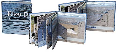 River D, in Lincoln City, Oregon, is the shortest river in the world! You will see ALL of it in this little book. Full page spreads have windows that open up to reveal details of river life. River D is printed using Giclée, a museum quality digital printing. River D is 2.67” x 2.87”, with hard cover, and 14 pages with 7 windows. Edition of 32, $85.