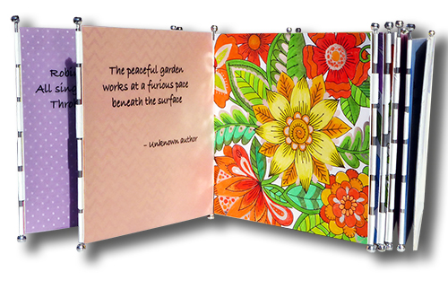 birds, butterflies, dragonflies, etc., in a stylized design with shiny metallic accents, pages are piano hinged together with metal rods and bead stops in an accordion folded style. Spring Color can be stretched out for an impressive display. Opposite of each image is a spring time haiku. Comes with matching clamshell case. Spring Color is 6" x 6", edition of 2, $495.