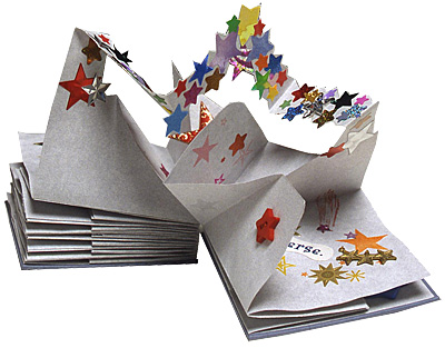 *Star Book*, 2005. Unfolding petal pages create a celestial pathway for a text describing a stellar friendship. Gocco printed on Environment Parchment with stickers, sequins, brass charms, buttons, brads, glow-in-the-dark stick-ons, lenticular panels, foamy shapes, puffed fabric, and stamped images added. Hardcover with eight unfolding double-page spreads. 2.75” square. Clamshell box. $630