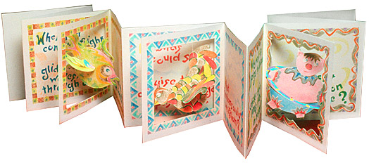 A wide-ranging reflection on the potential for human greatness sweeps across the page and three dangling illustrations add motion and excitement. A flying fish, a swimming bird, and a pig that knows how to swing in more than one way, expand into three-dimensional shape when the book is opened, yet fold flat when the book is closed. The text, borders and illustrations have been sponged-stenciled in dozens of colors on Rosa Spina Blanca paper. Ed Hutchins wrote, illustrated, and created the book. Carolyn Chadwick designed the custom clam-shell box. The book is 6.5” square, and can open to 36” wide. 2002. Edition of 15, $9500.