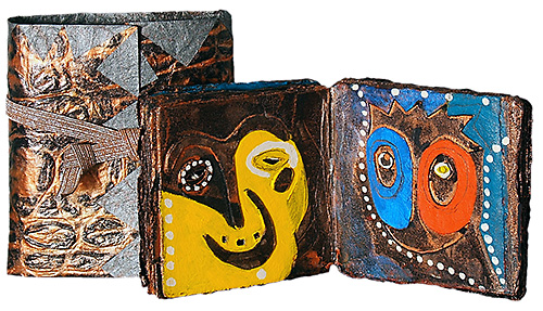 The Painted Faces Series portray the changing perceptions of spirits and their significance in human culture. Nightfall Faces shadow the unnamed dark and light spirits of forest and bush. Primary Faces (pictured) represent the named, primal, ancestral spirits of the village. The rattle becomes the rattles of the masked and painted spirit dancers in the clan houses. Harlequin Faces celebrate the festive, carnival faces of town. Primary Faces, a painter‘s book, 3“ x 3”, 5 pages with concealed rattle plus packet wrap, acrylic on multilayered and cut papers, unique, $340.