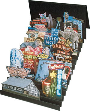 Highway 99 runs all the way from Canada to Mexico. Replaced by Interstate 5 in the mid-1960s, Highway 99 still beckons with neon signs, shaped buildings, gentle giants and other roadside attractions that take us back to simpler times and happy road trips. Hit the Road! is volume one in a series, featuring the state of Washington’s historic roadside attractions. The 19 attractions featured are displayed in geographically correct order from North to South in a single layer flag book with wrap around cover and clamshell box. Accompanied by a map spotlighting each location. 9” x 5.75” Edition of 25, $350.