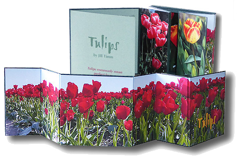 Tulips unfolds to 6 panels with images by nature photographer Jill Timm. This little book is 3"x 3". Edition of 25. $145.