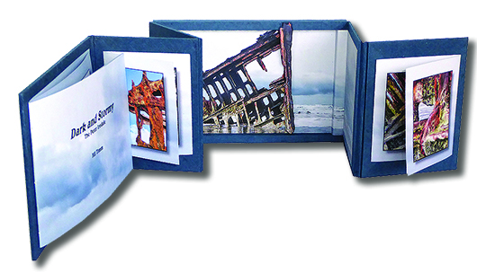 It wasa dark and stormy night in 1906 when the cargo ship, Peter Iredale, slammed into the Oregon coast. The iron skeleton is still there today. Dark and Stormy is a unusual book structure called the Japanese Screen Fold. It has 8 panels, a 7 page signature with the story of the eventful night, 3 foldout photo sections, and the ship with 3 dimensional elements, and a colophon. Comes with a portfolio enclosure. Dark and Stormy is 4" x 6". Edition of 20. $245.