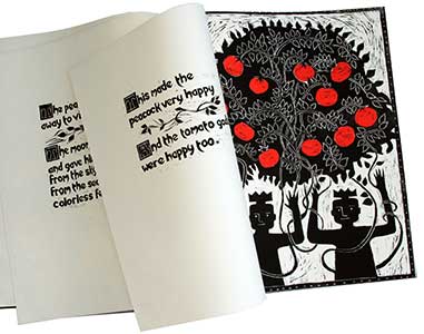 Another lino fable by Fran Watson telling a little known tale about this luscious fruit and revealing the strange facts about a mysterious exchange between the captive peacock and the tomato gods.